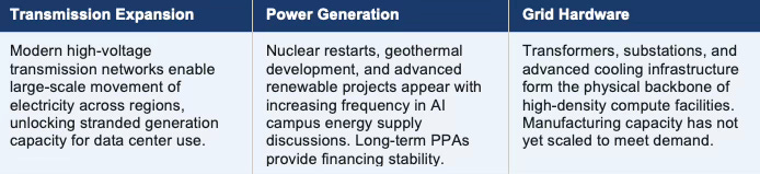 Infrastructure investors therefore face a constraint-driven opportunity landscape. Firms capable of expanding transmission capacity, energy generation, and grid hardware production will capture value created by the rapid expansion of AI compute demand.