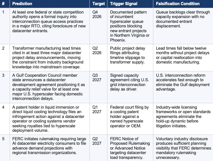 Gulf states — Saudi Arabia, UAE, Qatar — combine capital concentration with centralized permitting authority, enabling datacenter deployment at scale on timelines that U.S. permitting structures cannot match. NIBE Vision identifies them as the most likely near-term capacity relief valve for U.S. hyperscalers locked out of domestic interconnection queues. Prediction 3 in the falsifiable ledger follows directly. Capital positioned in Gulf datacenter infrastructure before U.S. hyperscalers publicly announce offshore deployment strategies will capture the geographic arbitrage.