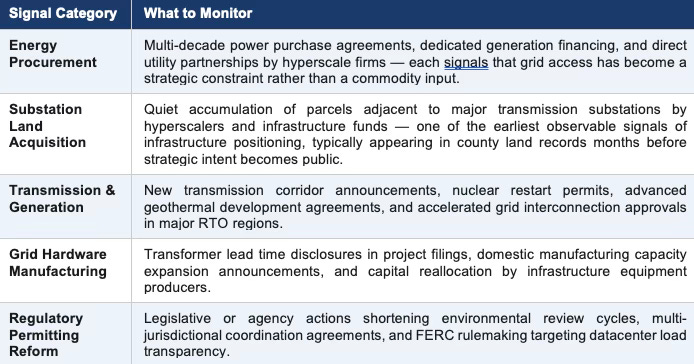 Infrastructure bottlenecks reveal themselves through observable market behavior before constraints become widely recognized. Within the MindCast AI framework, the signals below function as leading indicators of FLI elevation — early data points that the feedback gap between compute demand and infrastructure response is widening. Energy contracts, permitting acceleration, and infrastructure financing decisions often appear in public filings months before the underlying scarcity becomes consensus knowledge. Monitoring those signals allows investors and AI firms to detect structural shifts early and position capital before attractor formation is complete.