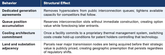 The system is in the Becker phase: scarcity exists at key constraint points, rational actors are appropriating scarce positions, and legal correction has not yet arrived. Queue position hoarding, exclusive energy contracts, land acquisition near substations, and proprietary infrastructure standards are predictable responses to a delay-dominant environment — not outliers. Each move rationally reduces the actor’s infrastructure exposure while deepening bottlenecks for competitors that follow. Where and how those moves cross into exclusionary conduct is the subject of Installment II.
