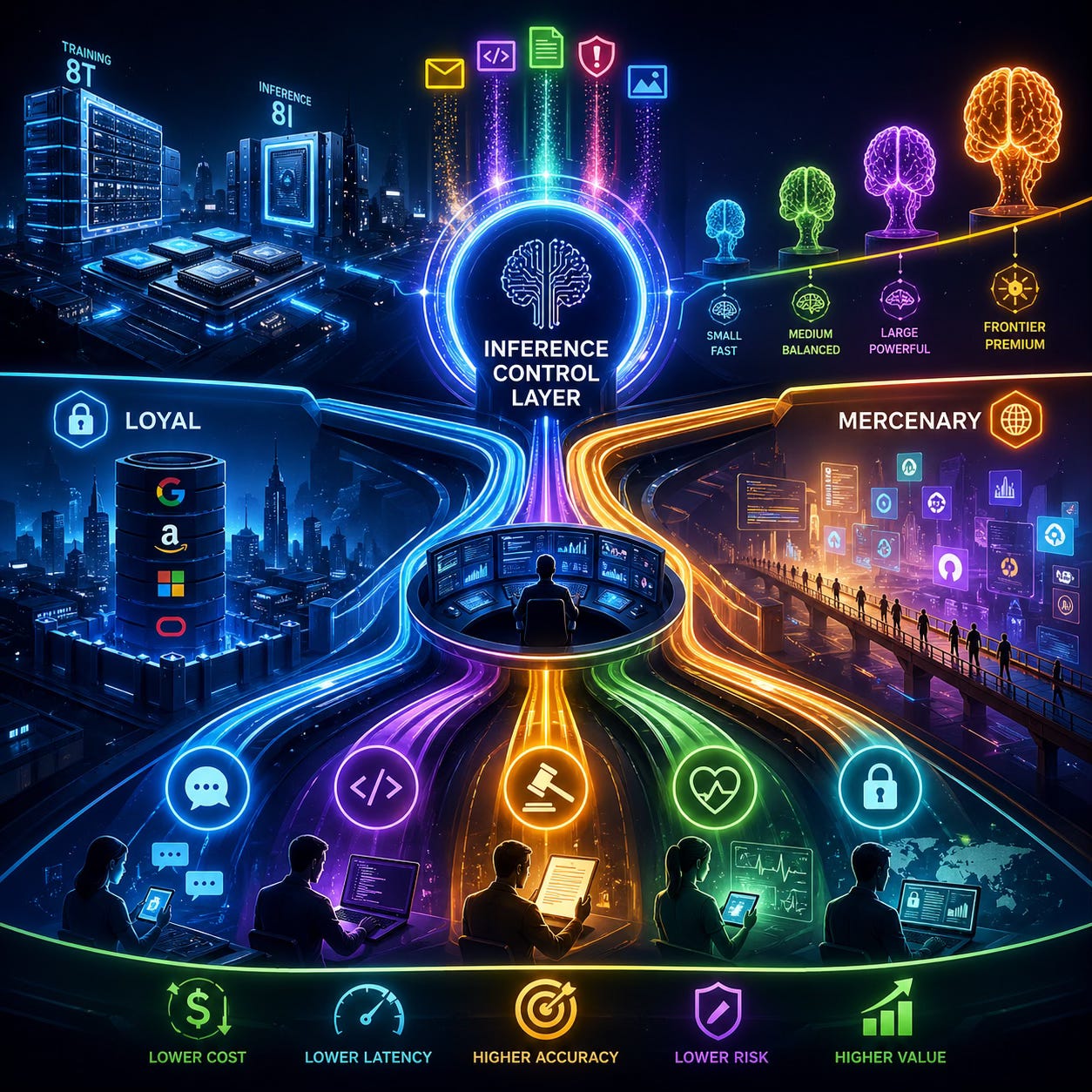 Inference without routing behaves as a commodity. Routing with feedback behaves as a control system. The unresolved question is whether routing consolidates inside hyperscaler stacks (Loyal architectures) or emerges as an independent control layer (Mercenary architectures). The answer determines where margin lands across the AI stack through 2028.