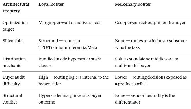 The architectural neutrality stops there. The Loyal versus Mercenary diagnostic exposes the structural conflict embedded in routing architecture itself. Routing decisions are not neutral. A hyperscaler-owned router operates as structurally Loyal — optimizing margin-per-watt on the hyperscaler’s native silicon (TPU for Google, Trainium and Inferentia for AWS, Maia for Microsoft). An independent middleware router operates as structurally Mercenary — optimizing for buyer outcome regardless of which provider’s silicon or model wins the routing decision.