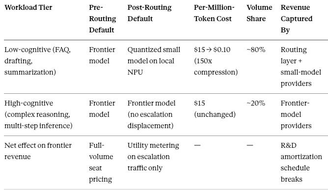 Margin Cannibalization: From Seat Pricing to Utility Pricing. The Routing Tax restructures the business model, not just the unit economics. Frontier-model revenue runs predominantly on per-seat licensing — $20 to $60 per user per month for productivity surfaces, $200-plus per user per month for enterprise tiers. Seat pricing assumes the seat is the unit of value capture: every user pays for frontier capability whether or not their queries require it. Mercenary routing breaks the assumption. Once an enterprise router determines that 80 percent of seat-driven queries route to quantized open-weight models on local NPUs at near-zero marginal cost, seat pricing collapses into pay-for-what-you-reason utility metering. The 20 percent of high-cognitive escalation traffic still prices at frontier rates. The 80 percent that does not stops generating frontier revenue. Seat pricing survives only where buyers cannot or do not deploy routing — a shrinking surface as Mercenary middleware matures and Loyal native routing ships inside hyperscaler stacks.