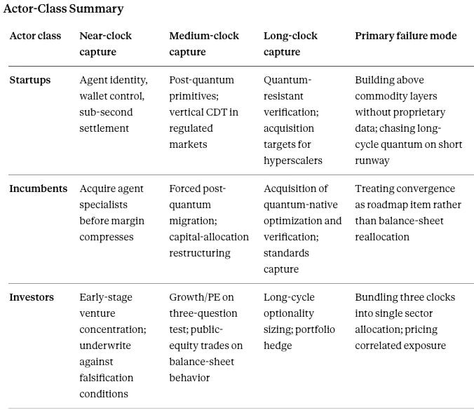 Reading the matrix. Diagonals carry the cleanest capture logic — startups on the near horizon, incumbents on the medium horizon through forced migration, long-cycle capital on the long horizon. Off-diagonal positions carry execution risk: startups chasing long-horizon quantum burn runway; incumbents competing on near-horizon agent infrastructure face faster, more focused competitors; investors holding near-horizon positions past the medium-horizon consolidation watch margins compress.