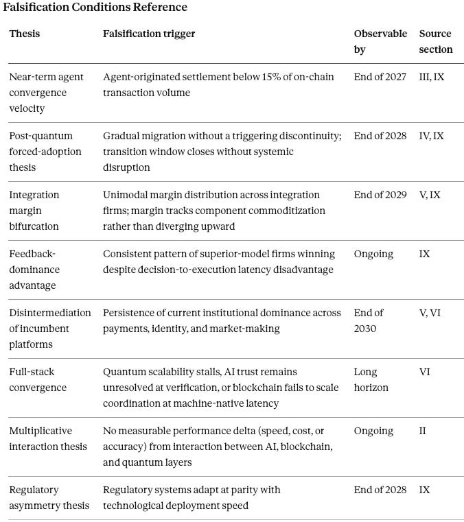 Consolidated falsification conditions. Full-stack convergence fails if quantum scalability stalls past the long-horizon window, AI trust remains unresolved at the verification layer, or blockchain fails to scale coordination efficiently at machine-native latency. Persistence of current institutional dominance across payments, identity, and market-making would falsify the disintermediation thesis. Integration-layer margin compression tracking component commoditization would falsify the control-reallocation thesis even if the technical convergence proceeds on schedule.