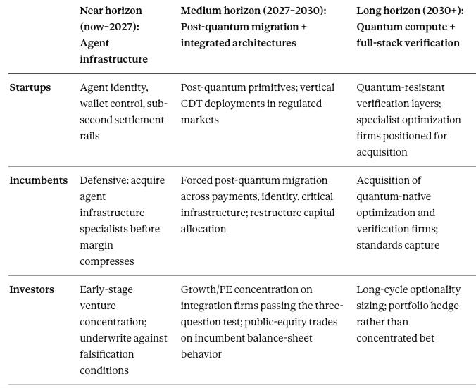 Banks, payment networks, and identity providers face the most compressed timeline. Post-quantum migration is non-discretionary and arrives before agent settlement scales. Acquisition of specialist post-quantum teams beats in-house rebuild on both speed and talent density. Incumbents that wait for regulatory clarity lose the window.