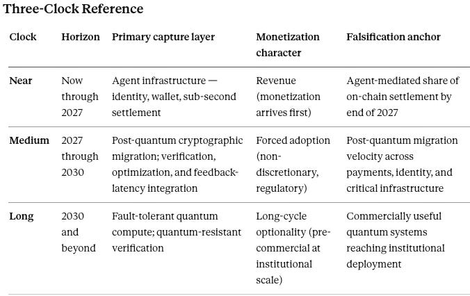 Markets misprice convergence by bundling three timelines into a single narrative. Agent infrastructure generates near-term revenue. Post-quantum migration drives forced adoption on a regulatory clock. Quantum compute remains long-cycle optionality. Correct pricing separates these layers and assigns capital accordingly. Bundled pricing transfers alpha from investors to issuers who narrate convergence faster than they deliver it.