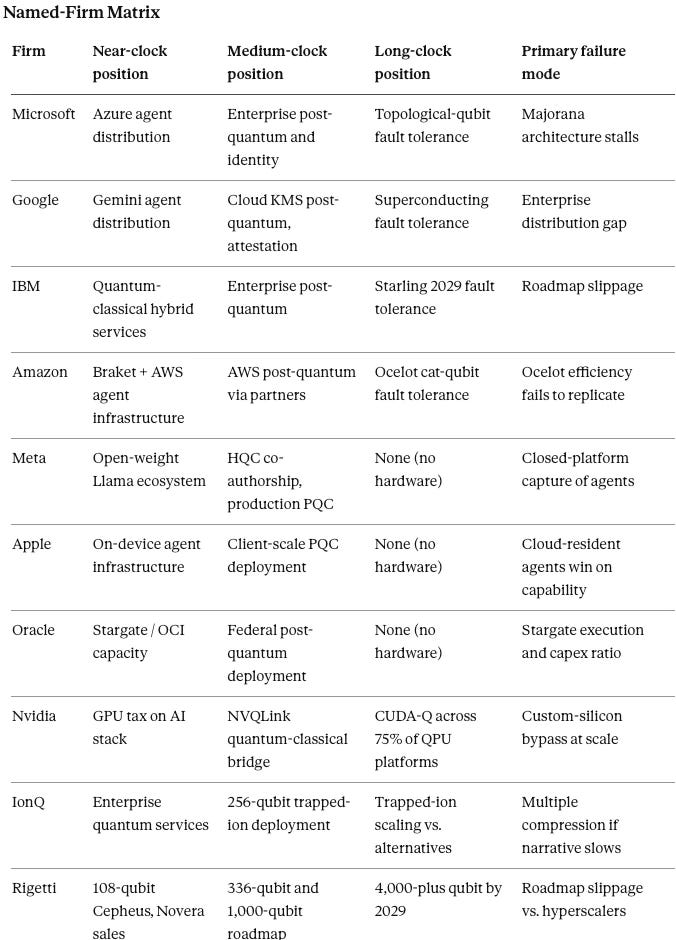 No named firm holds durable advantage across all three clocks. Microsoft and Google cover near and medium clocks and hold a long-clock option. IBM covers all three but carries public roadmap risk. Amazon and Nvidia occupy structurally distinct positions — Amazon as hybrid builder-marketplace, Nvidia as universal bridge — that insulate against single-architecture failure but depend on substrate growth continuing. Meta, Apple, and Oracle cover fewer clocks but own deeper positions within their covered layers. IonQ and Rigetti carry the pure-play exposure: if quantum scales on their architectures, valuations justify; if hyperscalers reach fault tolerance first, valuations compress.
