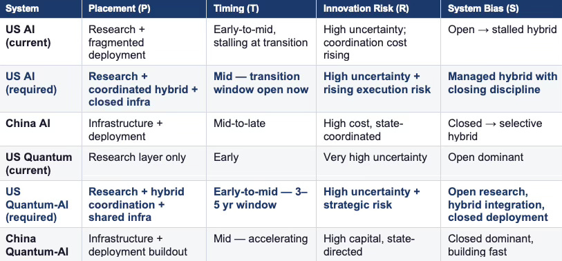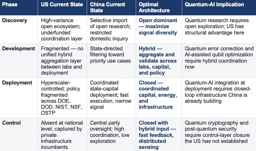 The bolded rows represent required positions — what US AI architecture and US quantum-AI architecture need to look like to compete effectively at the current phase boundary and at the quantum-AI coupling boundary 3–5 years out. At the AI layer, the US needs a managed hybrid with closing discipline — not full closure, but a coordinated aggregation mechanism that routes discovery-phase signals toward deployment-phase execution. At the quantum-AI layer, the US needs a three-zone architecture: open research preserved at the discovery layer, hybrid coordination built now for integration, and closed deployment infrastructure established before China locks in the infrastructure positions that quantum-AI coupling will require.