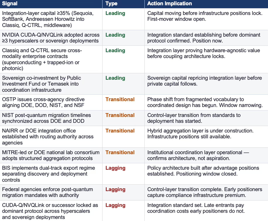 Deal Mix Shift (integration ≥35%): Integration-layer investments reach ≥35% of total quantum-AI capital. Currently below 20% — crossing 35% is the leading signal that capital has recognized the mispricing.
