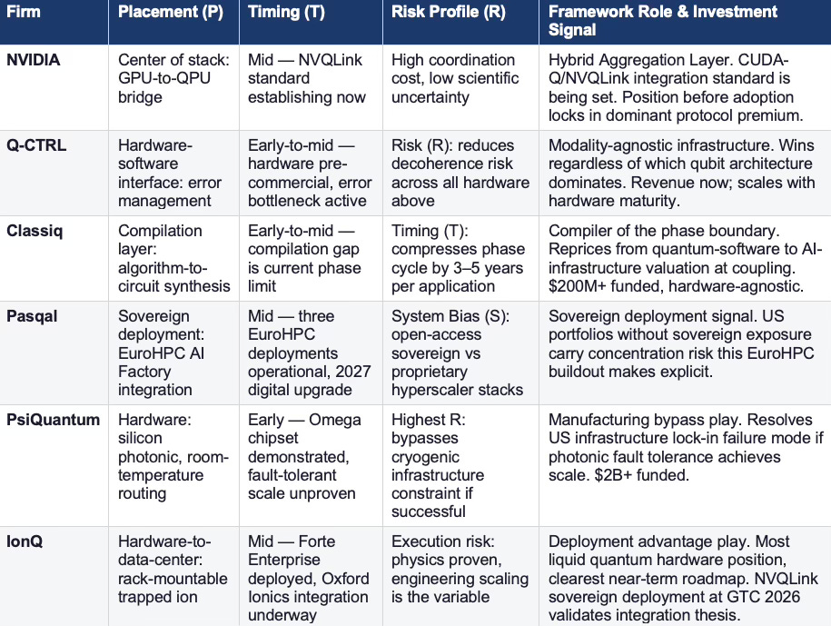 Portfolios concentrated in US hardware plays carry geographic concentration risk. China’s 1 trillion yuan National Venture Capital Guidance Fund is funded and building. Pasqal’s EuroHPC position, IonQ’s South Korea Quantum-HPC partnership, and SandboxAQ’s DoW CIO five-year agreement all represent the sovereign infrastructure positions that capital allocators must map explicitly. The portfolio hedge is structural: allocating to the quantum-AI integration layer — orchestration (NVIDIA), error management (Q-CTRL), compilation (Classiq) — provides exposure to the coupling event regardless of which national hardware program reaches fault-tolerant scale first.