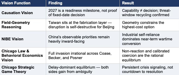 The most repeated Taiwan forecast in Washington is also the most analytically sloppy. Part I of this series showed that Beijing benefits structurally from upstream disruptions to the AI industrial stack — the Silence Dividend. Part II advances a harder claim: the standard “China invades Taiwan by a named year” narrative mistakes a capability milestone for a political deadline, ignores the semiconductor self-destruction constraint, and misreads a threat-window recycling equilibrium as foresight. Five MindCast Vision Function frameworks — Causation Vision, Field-Geometry Reasoning, National Innovation Behavioral Economics, Chicago Law and Behavioral Economics, and Chicago Strategic Game Theory — converge on a single output: China is building the option, but the evidence does not support a fixed-date invasion decision on the public timetable Washington keeps recycling.