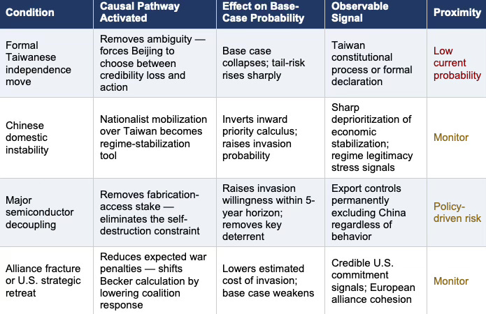 • A rapid or formal Taiwanese independence move that forces Beijing to choose between credibility loss and military action — removing the ambiguity that makes delay rational.