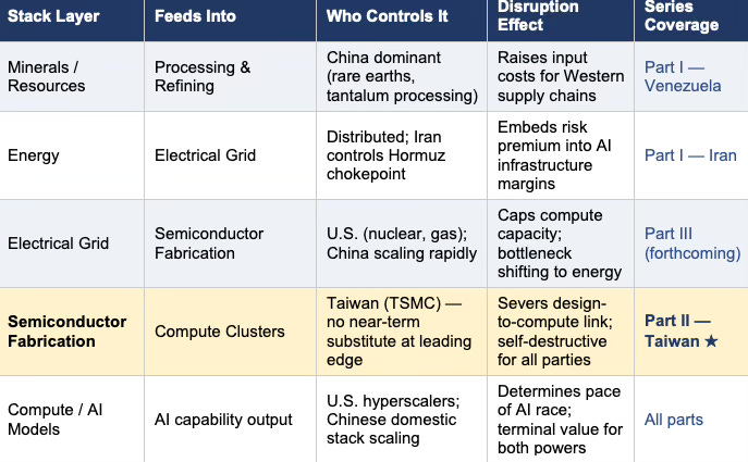 Part I of this series identified the deeper industrial structure beneath recent U.S. actions in Venezuela and Iran. Resources feed energy systems. Energy systems feed grids. Grids feed semiconductor fabrication and hyperscale compute. Geopolitical shocks at lower layers propagate upward into the economics of AI infrastructure. That framework does not stop at Venezuela or Iran. It also clarifies why Taiwan cannot be analyzed as a conventional territorial contest.