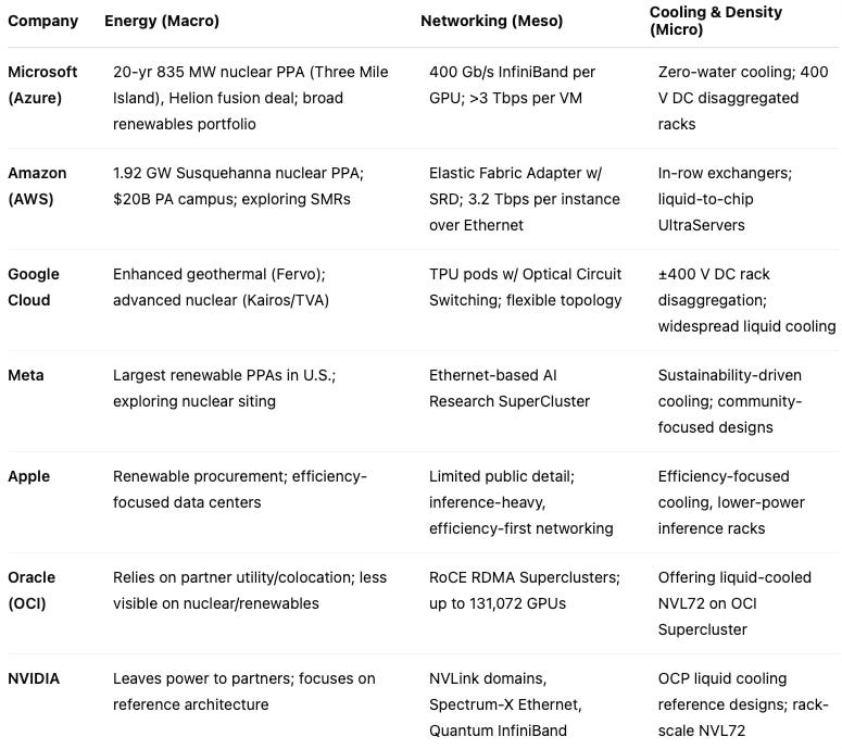 The comparative matrix distills how U.S. hyperscalers and vendors address the three layers of the bottleneck hierarchy. Arranging energy, networking, and cooling responses side by side makes clear where firms have secured durable advantages and where they depend on partners.