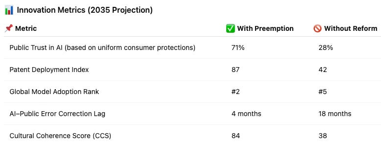 National coherence isnât bureaucracyâitâs readiness. The preemption clause marks a new chapter in U.S. leadership: structured scale, consistent standards, and high-trust innovation.