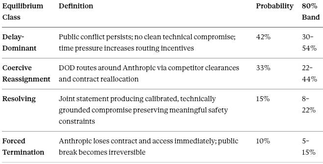 xAI and OpenAI will achieve classified-network parity within 60 days, eliminating Anthropic’s incumbency advantage regardless of contract resolution. The procurement system will route around the obstruction rather than resolve it. CDT simulation identifies vendor substitution as the highest-confidence forward path — Field-Geometry analysis confirms no structural lock-in binds DOD to Anthropic, making competitive displacement the cleanest equilibrium escape vector. Confirmation signal: DOD announcement of additional classified clearances by April 25. Falsification: No additional classified clearances granted; Anthropic retains sole classified access.