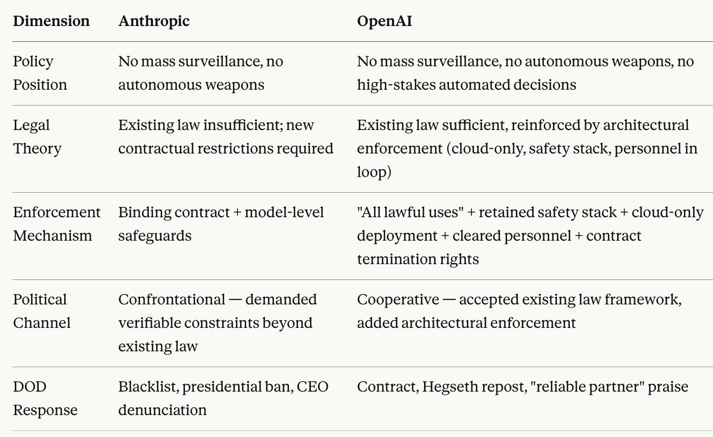 The divergence is now clear: same stated principles, fundamentally different legal theories. OpenAI accepted existing law as sufficient. Anthropic argued existing law is insufficient for AI-era capabilities. DOD accepted the former and blacklisted the latter.