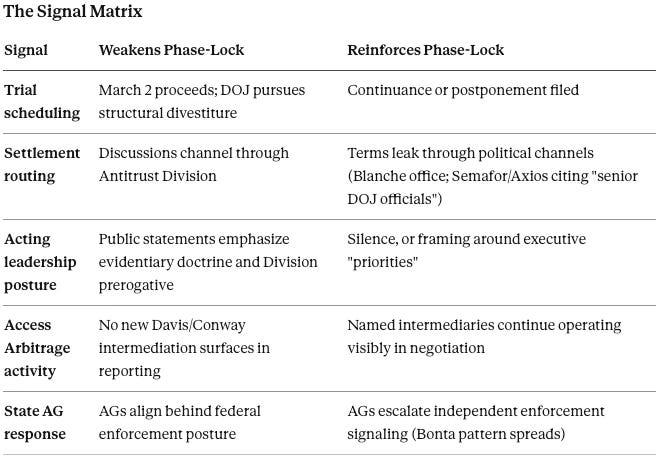 Bondi and Blanche installed Omeed Assefi as Acting AAG for Antitrust — the same role he held at the start of the second Trump term before Slater’s confirmation. The Live Nation trial is scheduled for March 2 — eighteen days from now. Between today and that date, observable signals will either reinforce or weaken the phase-lock thesis: that federal antitrust enforcement has crossed the point at which outcomes are determined entirely by access rather than evidence, structural remedies are unreachable, and the system cannot self-correct from within.
