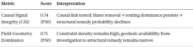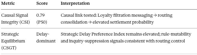 Behavioral settlement remains the dominant attractor under routing-dominant geometry. Structural divestiture requires an observable shift in authority topology — not a tone adjustment.