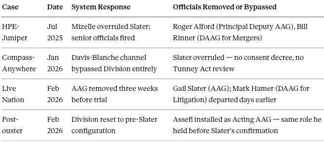 The Slater ouster does not operate in isolation. It is the terminal event in a seven-month sequence that has removed, in order: Roger Alford (Principal Deputy AAG), Bill Rinner (DAAG for Civil Enforcement and Mergers), Mark Hamer (DAAG for Litigation and Civil Enforcement), and now Slater herself.