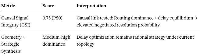 CDT foresight simulations were run on three institutional actors to quantify the structural analysis above. Results indicate continued geometry dominance and delay-optimized strategic posture across all modeled actors.
