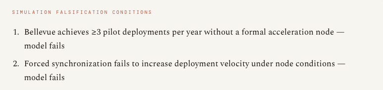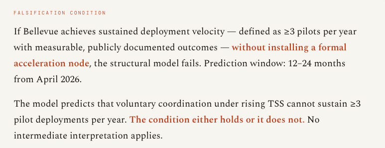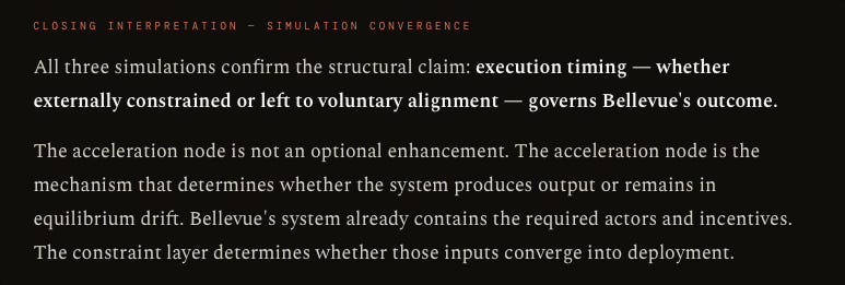 The second-degree implication drawn from the National Innovation Behavioral Economics (NIBE) and Strategic Behavioral Coordination (SBC) frameworks reinforces the diagnosis: systems fail not when incentives are weak, but when coordination timing diverges under load. Bellevue’s actors are aligned in intent. Misalignment operates at the execution timing layer — and no amount of additional convening resolves a timing coordination failure. Only a structural forcing mechanism does.
