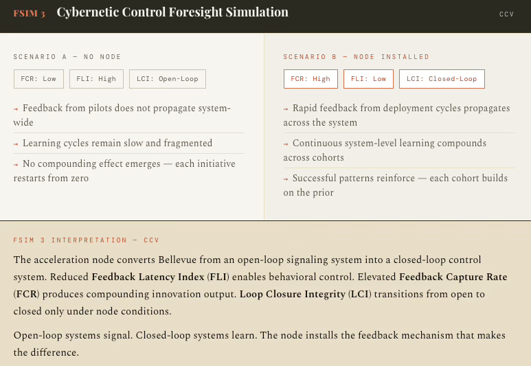 Under Scenario B, FCR registers high, FLI registers low, and LCI closes. Rapid feedback from deployment cycles propagates across the system. Continuous system-level learning compounds across cohorts. Successful patterns reinforce — each cohort builds on the prior. Open-loop systems signal. Closed-loop systems learn. The node installs the feedback mechanism that makes the difference.
