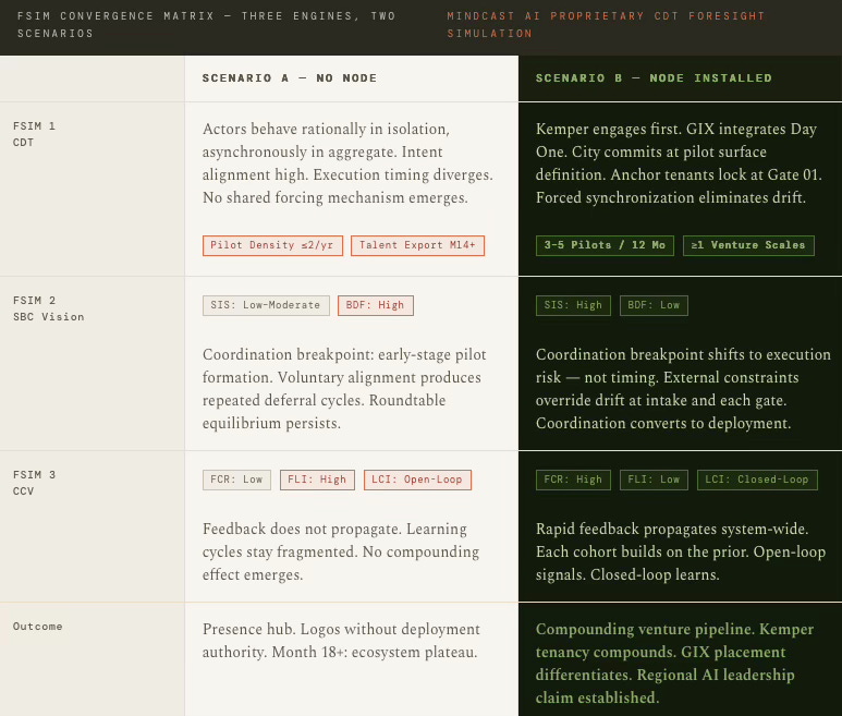 MindCast ran three parallel Foresight Simulations (FSIMs) across the two scenarios — no node versus node installed — using the MindCast AI Proprietary CDT Foresight Simulation, the Strategic Behavioral Coordination Vision (SBC Vision), and the Cybernetic Control Vision (CCV). All three simulation engines converge on the same structural finding. Full simulation logs appear in Appendix II. The body-level synthesis follows.