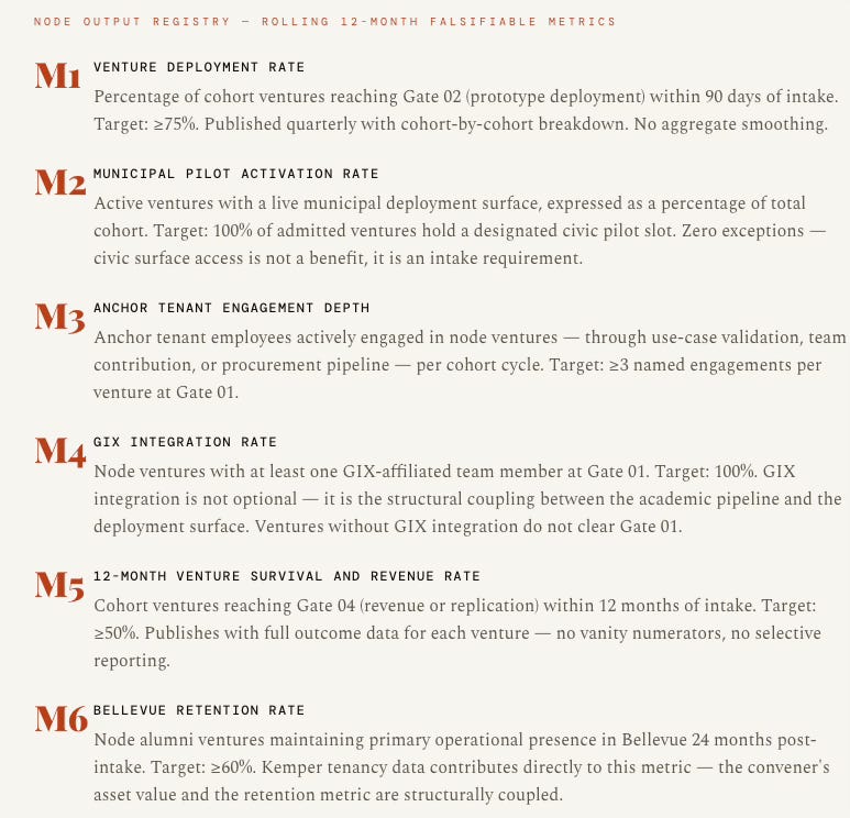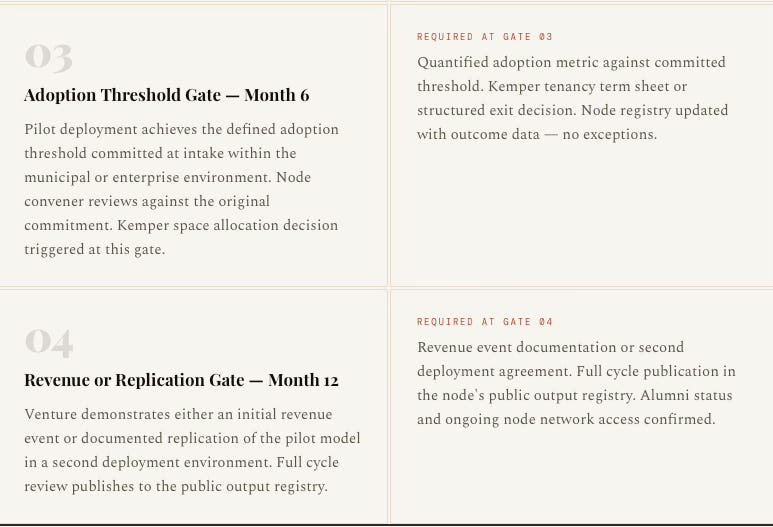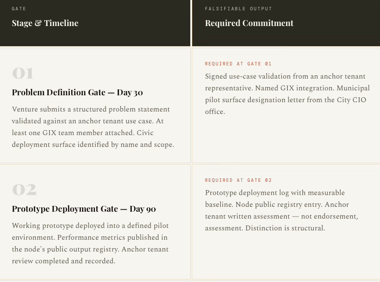 Every venture entering the node commits to four falsifiable gates across a 12-month deployment cycle. Gates are cross-actor commitments that bind the venture, the node, and at least one anchor participant at each stage — not traditional incubator milestones. Non-completion at any gate triggers a structured exit protocol rather than indefinite extension. The selection committee includes Kemper in the convening role, a GIX faculty seat, a rotating anchor tenant representative, and a civic infrastructure designee from the City Manager’s office. No seat is ceremonial.