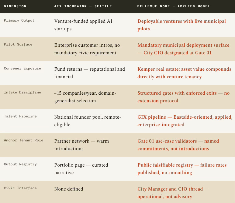 Acknowledging that matters because the Bellevue node argument does not rest on an applied-versus-research distinction. The AI2 Incubator already occupies the applied lane. The argument rests on something more specific: the structural variables that determine whether an incubation program converts into compounding deployment output at the municipal scale — and those variables are precisely what the AI2 Incubator, operating from Seattle without a defined civic pilot surface or a convener with asset exposure to outcomes, does not provide.