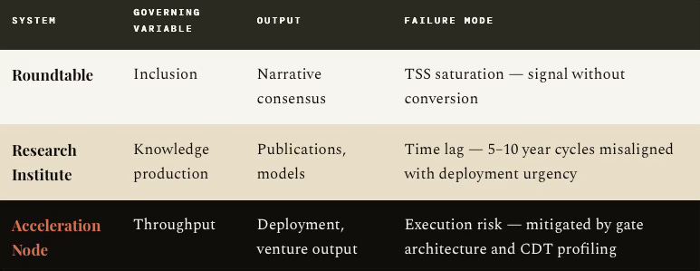 The difference between a civic roundtable and an acceleration node is a convener with skin in the game, a defined intake process, and a falsifiable output metric.