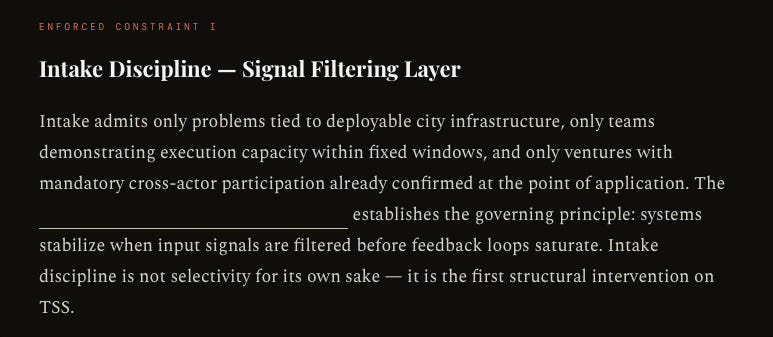 The anchor tenants’ control point is talent acquisition and product intelligence. All three operations share the same structural problem: identifying applied AI talent calibrated to enterprise deployment environments before it enters the general market. The node’s intake pipeline is a curated talent observation surface — Gate 01 participation is early signal access, not philanthropy. The use-case validation requirement simultaneously feeds product intelligence back into anchor tenant development priorities. Both returns are structural.