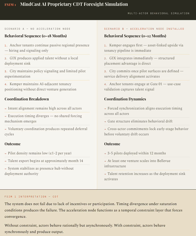 MindCast runs targeted Foresight Simulations (FSIMs) using three simulation engines — the MindCast AI Proprietary Cognitive Digital Twin (CDT) Foresight Simulation, the Strategic Behavioral Coordination Vision (SBC Vision), and the Cybernetic Control Vision (CCV) — to model institutional behavior under two conditions: Scenario A (no acceleration node) and Scenario B (node installed). The simulations identify coordination dynamics, actor sequencing, feedback loop behavior, and deployment outcomes across a 12–24 month window. Core result: Bellevue’s system remains open-loop without a forcing mechanism and transitions to a closed-loop control system only under constraint-driven acceleration.