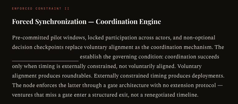 Systems under rising TSS cannot resolve through discussion. Forced execution under constraint is the only mechanism that clears a coordination bottleneck once intent alignment has already been established. Bellevue has the intent alignment. The node installs the constraint.