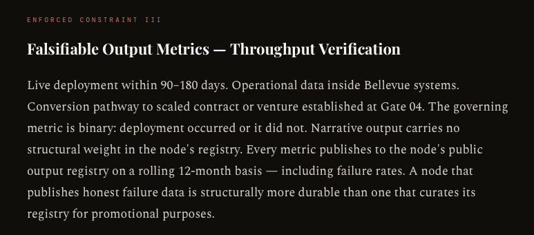 The node’s credibility depends entirely on whether its output metrics are genuinely falsifiable and publicly tracked. Innovation programs that define success as “vibrant ecosystem” or “increased collaboration” carry no mechanism for honest self-assessment and no credibility with institutional audiences. MindCast’s predictive methodology requires every institutional claim to be expressible as a testable proposition. The node publishes the following metrics on a rolling 12-month basis — including failure data.