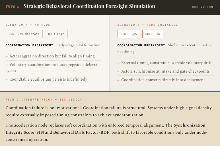 Under Scenario B, SIS registers high and BDF registers low. External timing constraints override voluntary drift at intake and at each gate checkpoint. Coordination converts directly into deployment. The coordination breakpoint shifts from timing failure to execution risk — a categorically different and manageable problem.