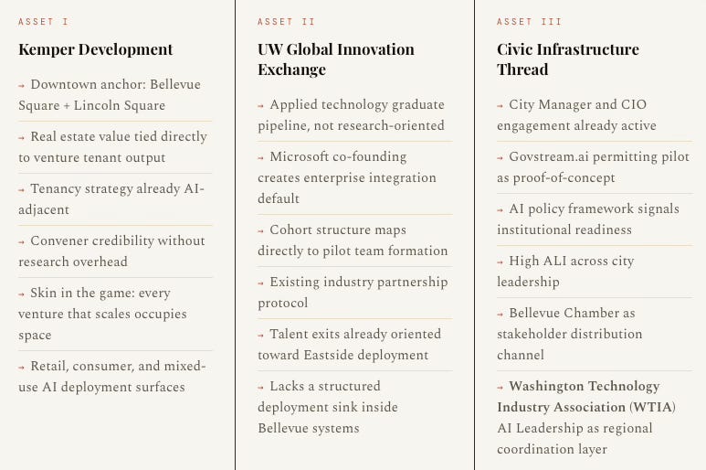 Kemper’s control point is real estate value. The node converts the Downtown Bellevue footprint from a passive AI-adjacent backdrop into an active venture production environment. Every node alumnus that scales into a Kemper building is a direct return on the convening investment. Civic credibility is secondary — the tenancy pipeline is primary. The asset model is structurally sound without requiring mission alignment.