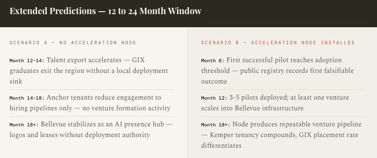 Bellevue does not need to become Seattle to win. Bellevue needs to become what its asset stack already makes possible — the applied AI deployment node that converts the Pacific Northwest’s most concentrated enterprise AI presence into a structured venture output engine with a public track record and a falsifiable claim on regional AI leadership.