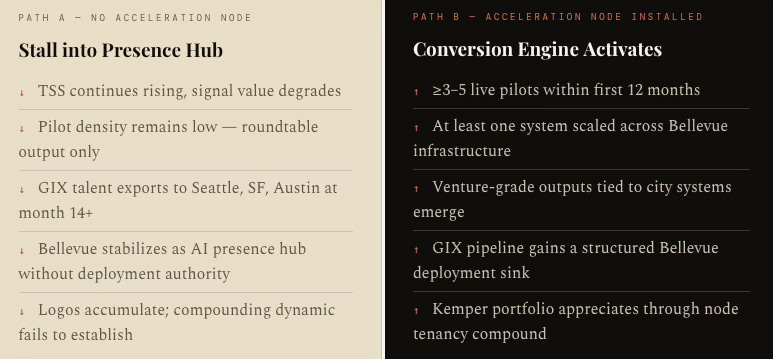 Whether a conversion layer installs before saturation collapses signal value determines Bellevue’s outcome over the next 12–24 months. The CDT simulation of the stall scenario identifies the tipping point at approximately month 14 of the current cycle. Anchor tenant presence generates sufficient narrative momentum to suppress urgency through approximately month 18, at which point talent density begins to export — GIX graduates who find no structured deployment pipeline in Bellevue take their output to Seattle, San Francisco, or Austin. Recovery from stall requires an external forcing event of a scale that is neither predictable nor structurally engineerable after the fact.