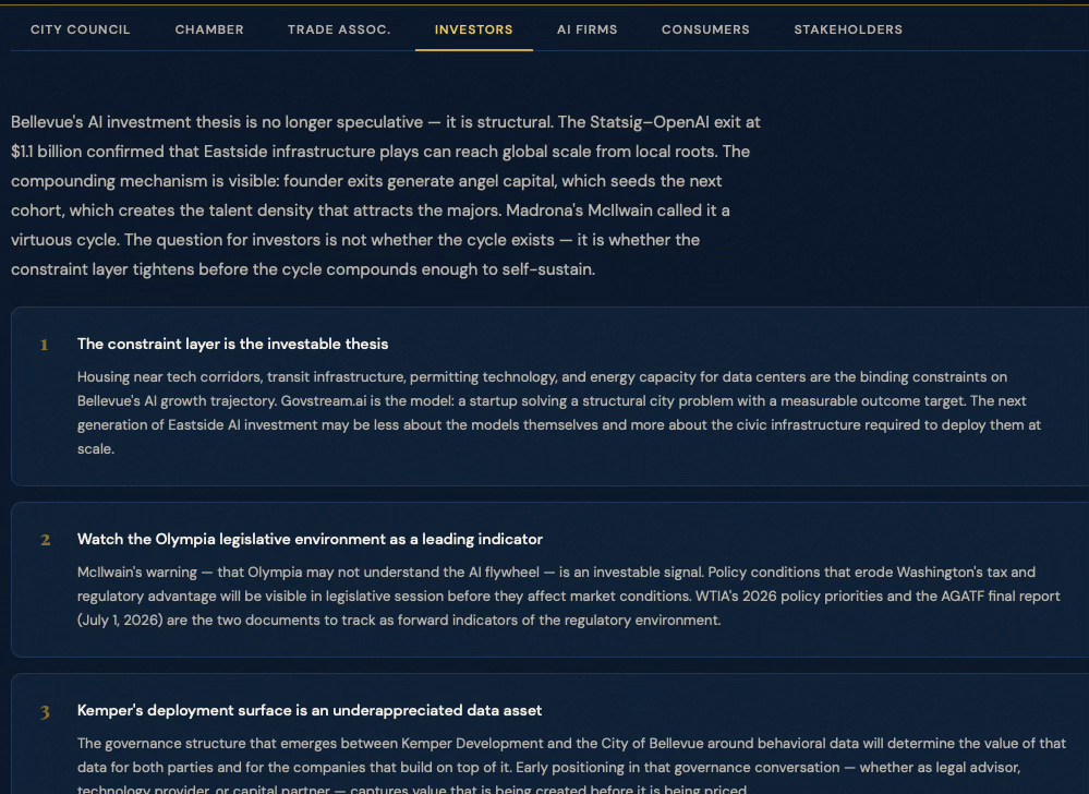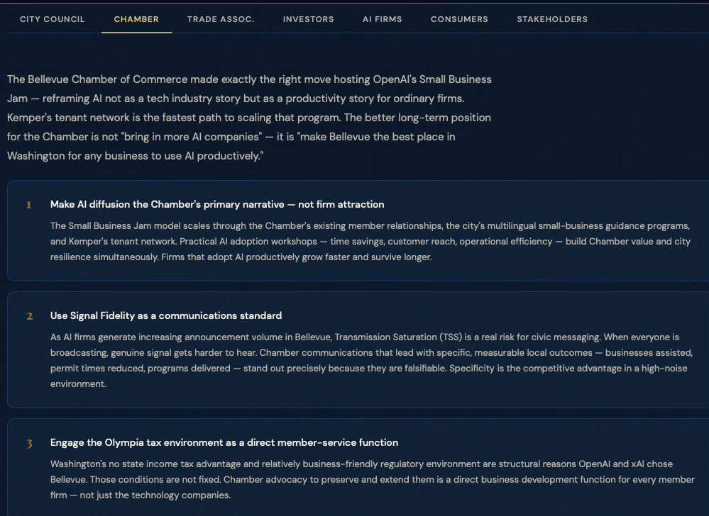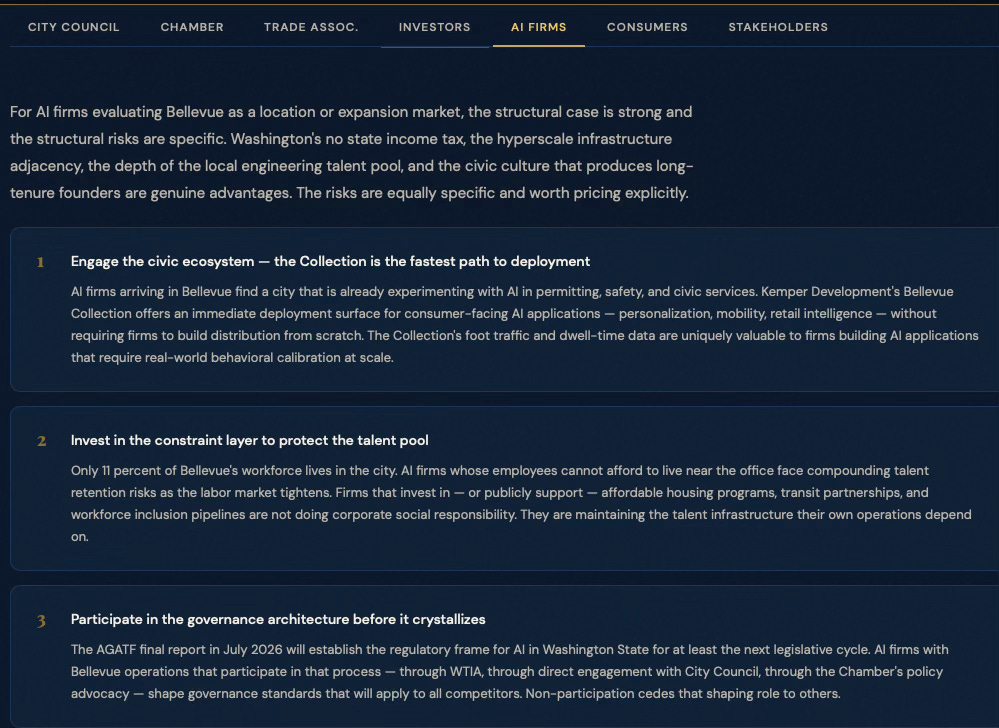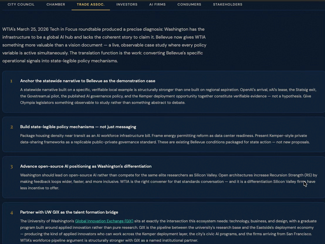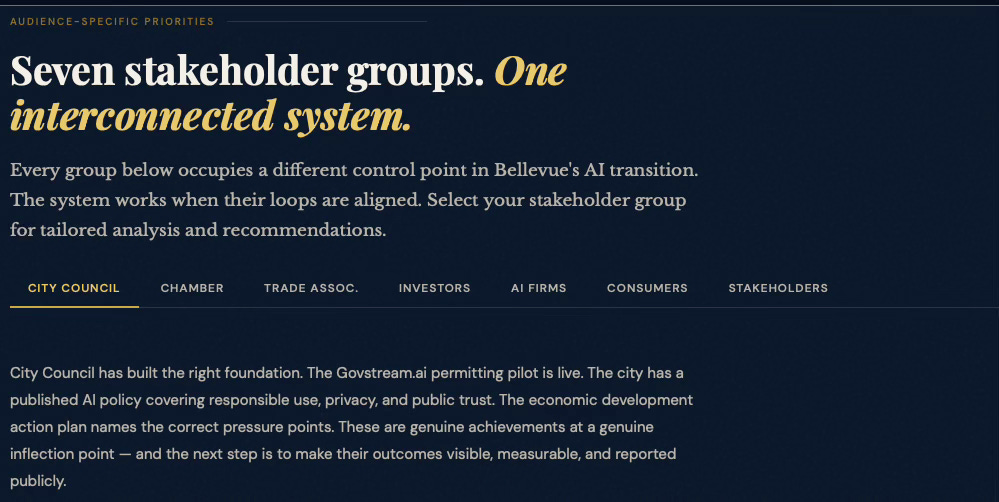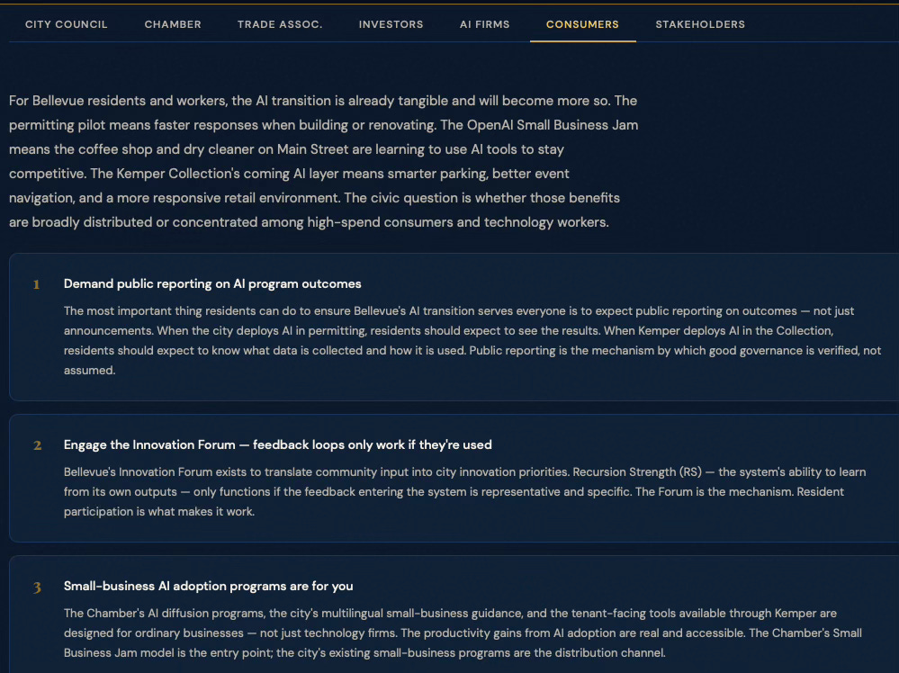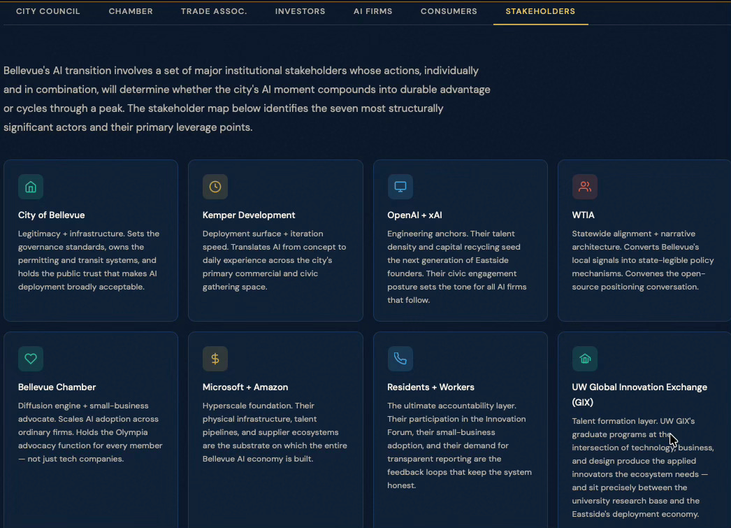 BellevueAI SimulationCybernetics SuiteEconomics VisionCybernetic FoundationsGeekWire — OpenAI BellevueGeekWire — WTIA RoundtableSmart Cities Dive — Govstream.aiCity of Bellevue AI PolicyBellevue Chamber — Small Business JamUW Global Innovation Exchange