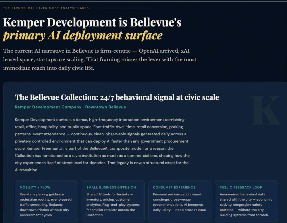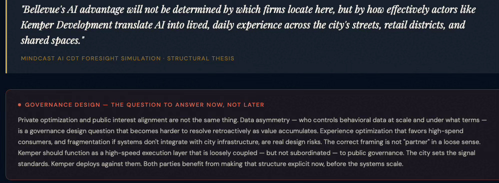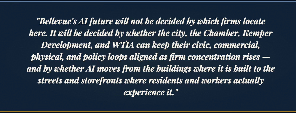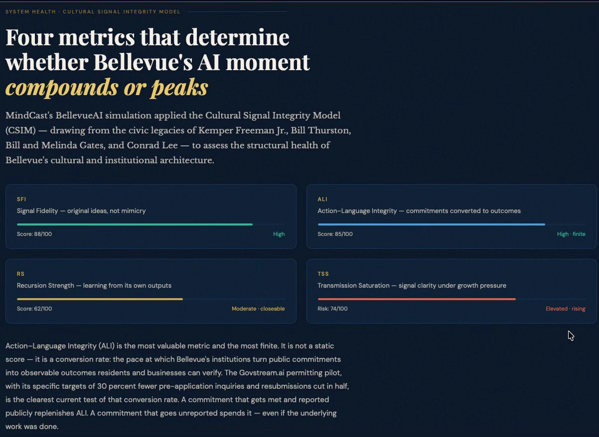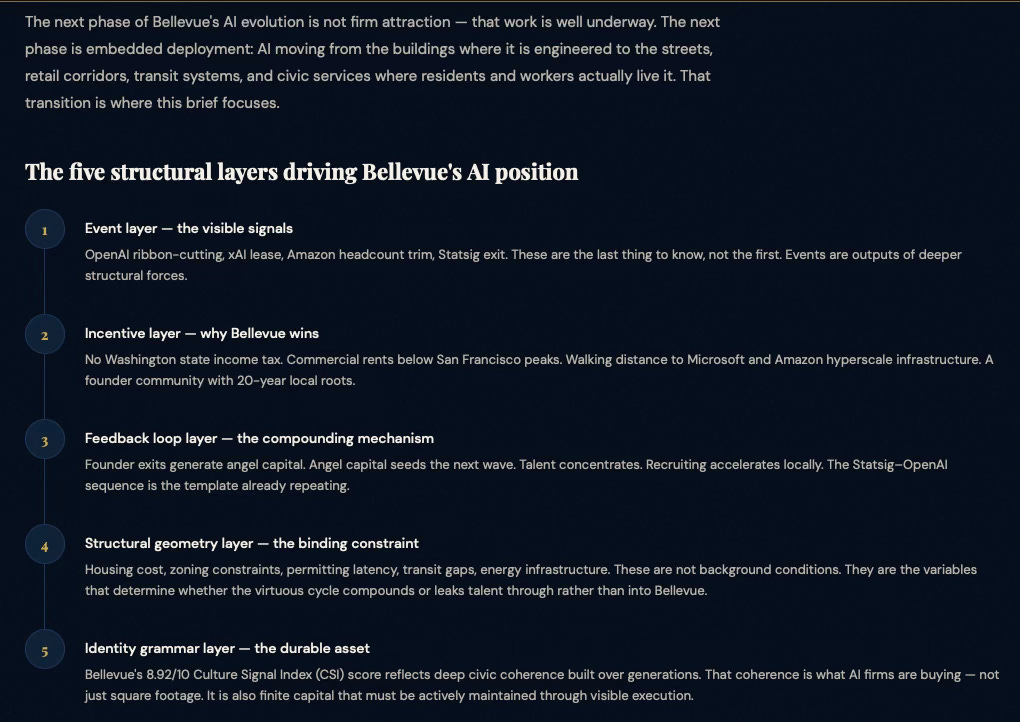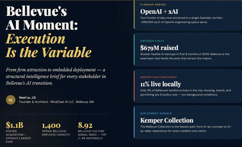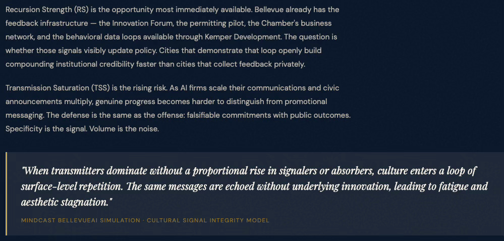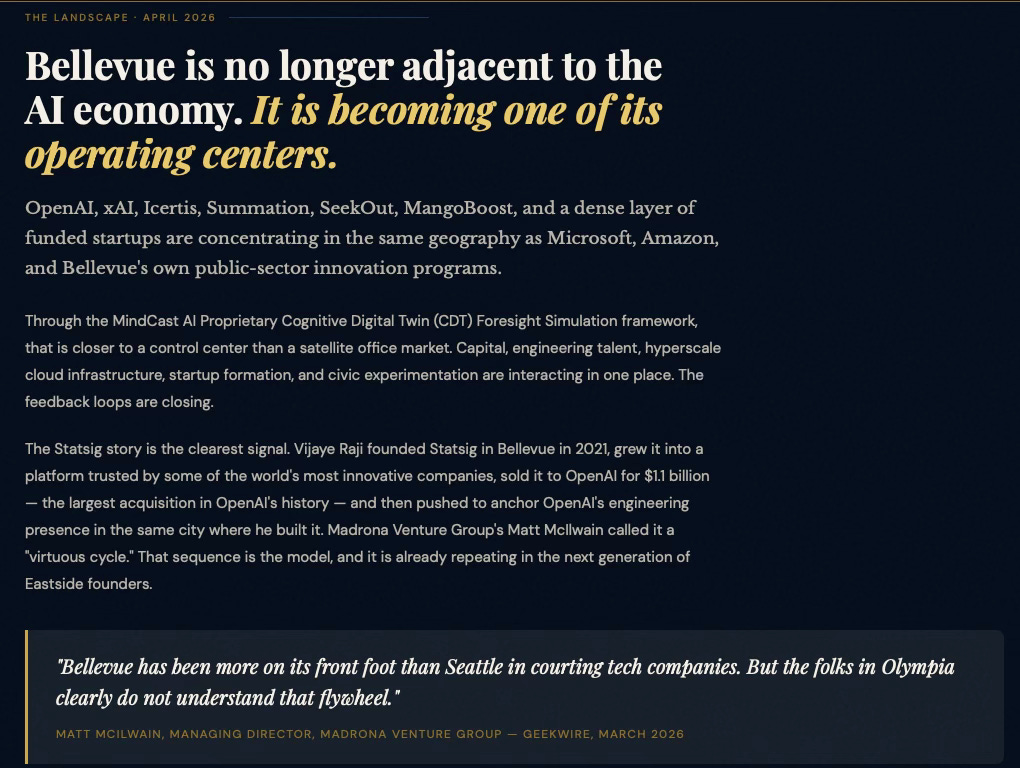 To demonstrate MindCast predictive game theory AI applicability to municipal AI innovation ecosystems, MindCast prompted an LLM to apply our works in predictive game theory AI, cybernetic equilibrium systems and BellevueAI, a publication MindCast previously published on the cultural legacy of Bellevue, WA (MindCast’s home base). MindCast then prompted an LLM to apply these works to publicly available data on AI activity in Bellevue, with the goal of crystalizing the Bellevue AI landscape for policy makers, trade associations, investors, AI firms.