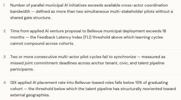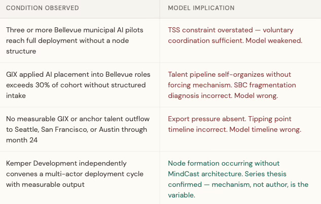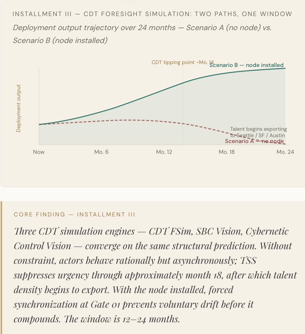 The CDT simulation projects a 14–18 month window before narrative momentum suppresses urgency and GIX graduates who find no structured deployment pipeline in Bellevue take their output elsewhere. Three of the four structural commitments required to install the conversion layer are relationship decisions, not resource decisions. The window is open. The architecture is specified. The remaining question is whether the actors move before the tipping point forecloses voluntary action.