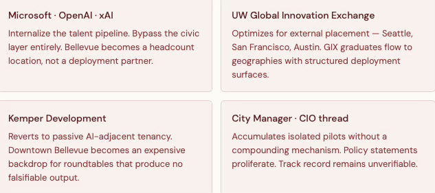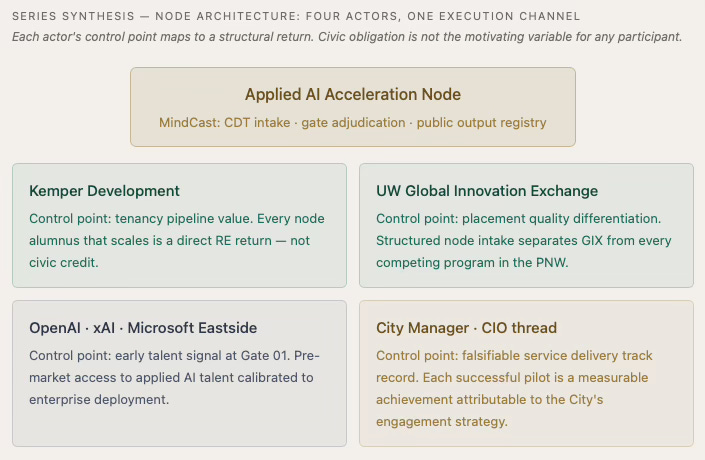 Installment III resolves the constraint with a structural intervention: an Applied AI Acceleration Node built on three asset classes already present in Bellevue at Day One — Kemper Development as the real-estate-anchored convener, the UW Global Innovation Exchange as the talent intake channel, and the City Manager / CIO thread as the mandatory civic pilot surface. No new capital formation at scale is required. Three of the four structural commitments are relationship decisions.