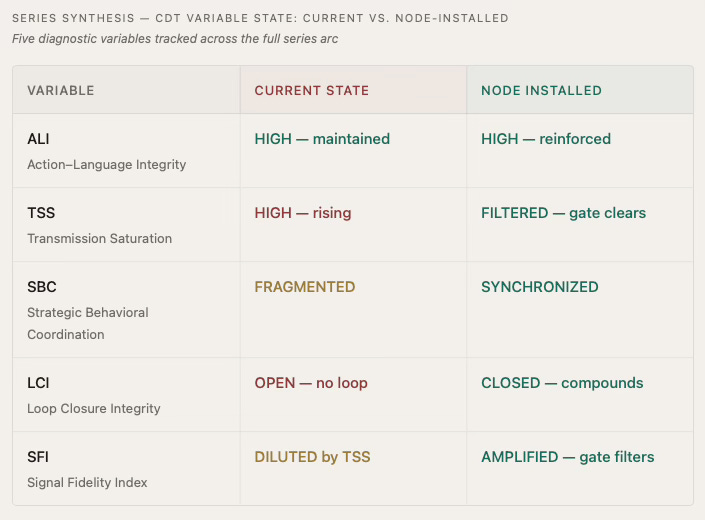 The three installments build a single argument no individual piece completes alone. Installment I proves the inputs are real. Installment II proves inputs don’t automatically convert. Installment III proves conversion requires a specific architectural intervention — and that the assets for it are already in place. The two synthesis views below show the full variable transformation and the actor architecture that no single installment presents together. The table introduces two additional CDT variables: Loop Closure Integrity (LCI), which measures whether feedback from deployments propagates back through the system, and the Signal Fidelity Index (SFI), which measures the quality of actionable deployment signals against ambient ecosystem noise.