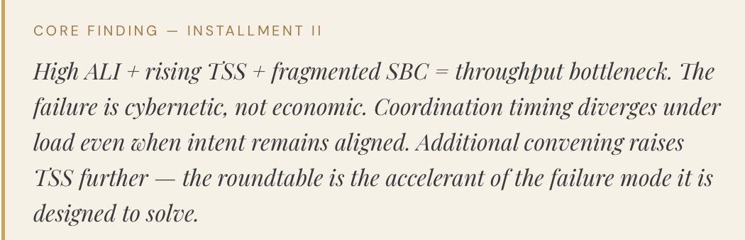INSTALLMENT II ESTABLISHESThe failure mode is precisely identified: timing coordination divergence under load. More convening makes it worse. Only a structural forcing mechanism resolves it.