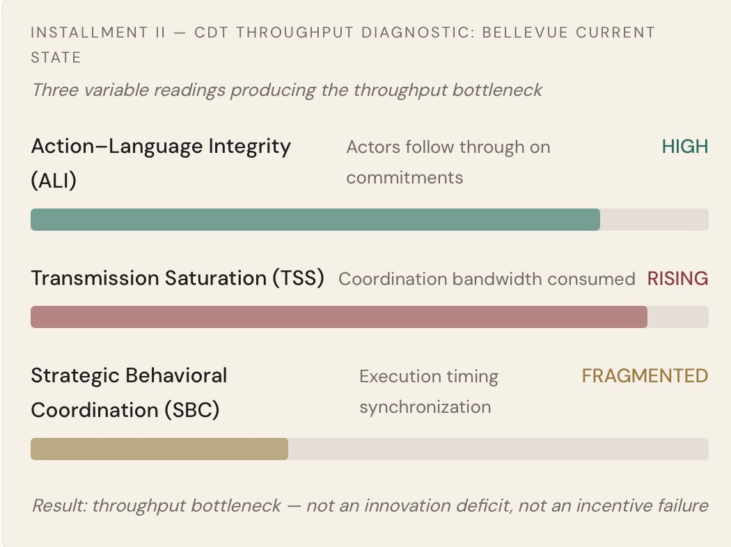 Installment II introduces the diagnostic framework that gives the series its analytical core. Bellevue’s actors are doing the right things: commitments are honored, incentives are aligned, and Action–Language Integrity (ALI) is high across the ecosystem. The CDT methodology surfaces something more precise than a failure — it surfaces a structural condition that is both the source of the bottleneck and the reason it is solvable. The constraint does not operate at the level of ambition or capital. It operates one layer deeper, in the cybernetic control structure of the ecosystem.