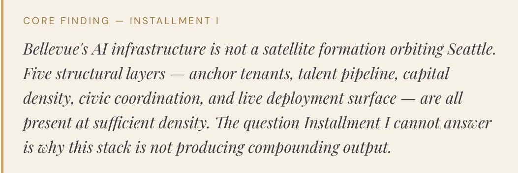Installment I answers the prior question before the series can proceed: is Bellevue’s AI density real, or is it a narrative constructed around Microsoft’s existing campus? The CDT methodology is applied to publicly available data — anchor tenant footprint, civic infrastructure, capital density, and the municipal AI deployment surface — to produce an ecosystem map. The finding is structural, not promotional.
