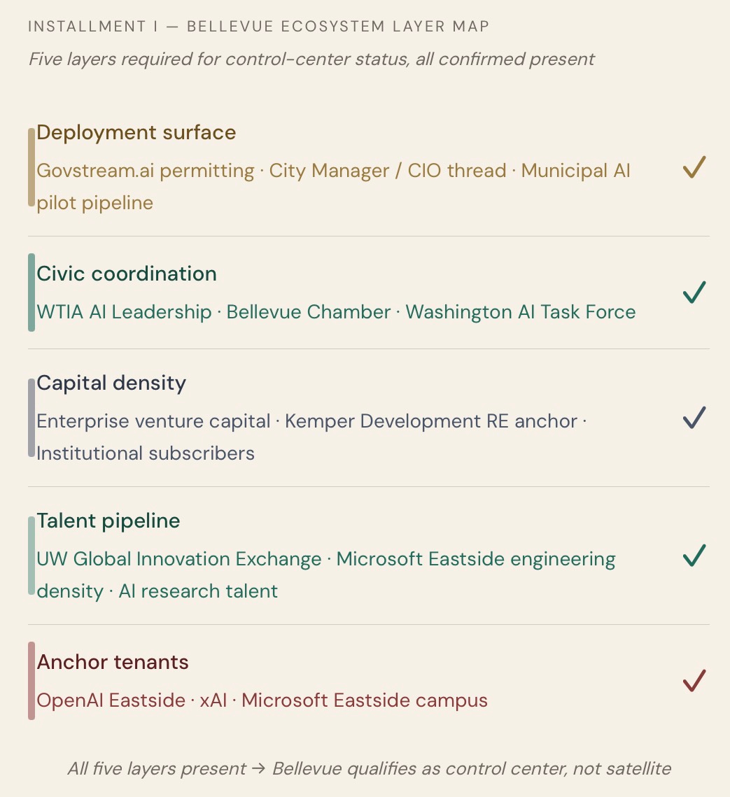 Bellevue hosts OpenAI, xAI, and Microsoft’s Eastside campus as a result of a specific configuration of commercial real estate, governance speed, and enterprise talent concentration the Seattle core cannot replicate. Govstream.ai’s permitting deployment is already operational. The Washington Technology Industry Association (WTIA) AI Leadership network and the Bellevue Chamber provide civic convening infrastructure. Five structural layers are confirmed present — all five required for control-center rather than satellite status.