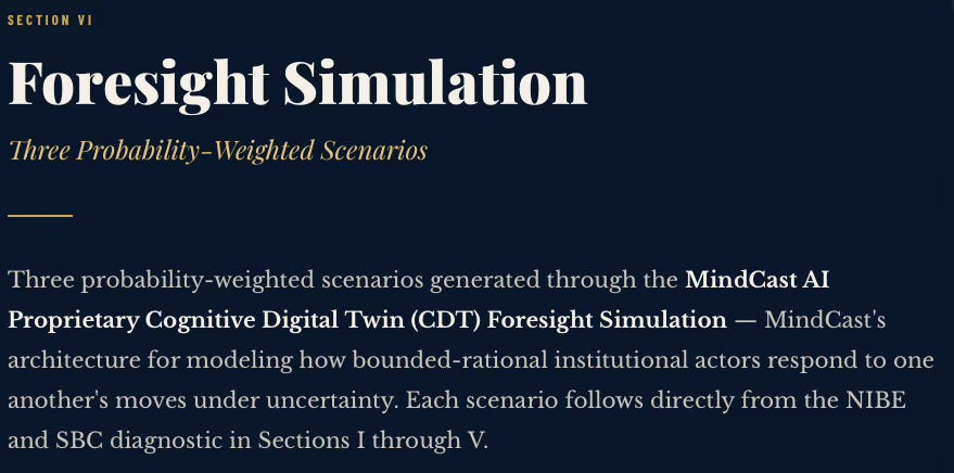 Contact mcai@mindcast-ai.com to partner with us on Predictive Law and Behavioral Economics + Game Theory Foresight Simulations. To deep dive on MindCast upload the URL of this publication into any LLM and prompt ‘reconstruct MindCast framework with three degrees of cited sub links.’ See Live-Fire Game Theory Simulators, Runtime Predictive Infrastructure